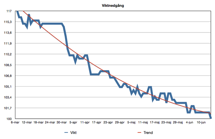 Här är min kurva. Jag använde verktyget på Hemma Bäst för att hålla koll på min vikt, men det finns massor med alternativ till det, och iPhone-appar och liknande så klart.